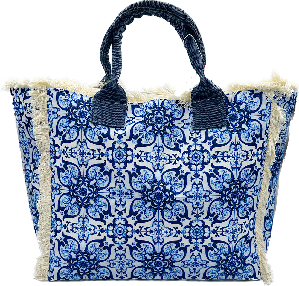 Beach bag with typical Sicilian patterns, ideal for the beach or leisure. Partial closure with metal zip,